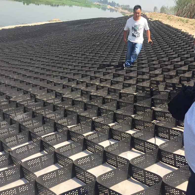 土工格室是由強化的HDPE片材料,經高強力焊接而形成的一種三維網狀格室結構。一般經超聲波針式焊接而成。因工程需要,有的在膜片上進行打孔。