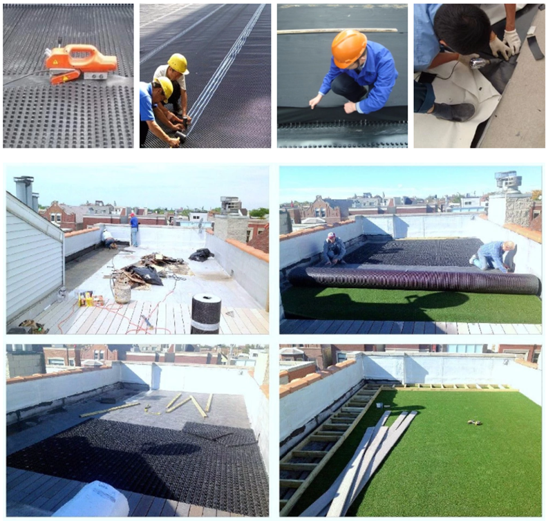 防排水保護板可以有效地保護構(gòu)筑物和防水層,并且抵抗土壤中的各類酸堿和植物的根刺。在地下室外墻回填土?xí)r,它可以保護建筑物和防水層免遭破壞。